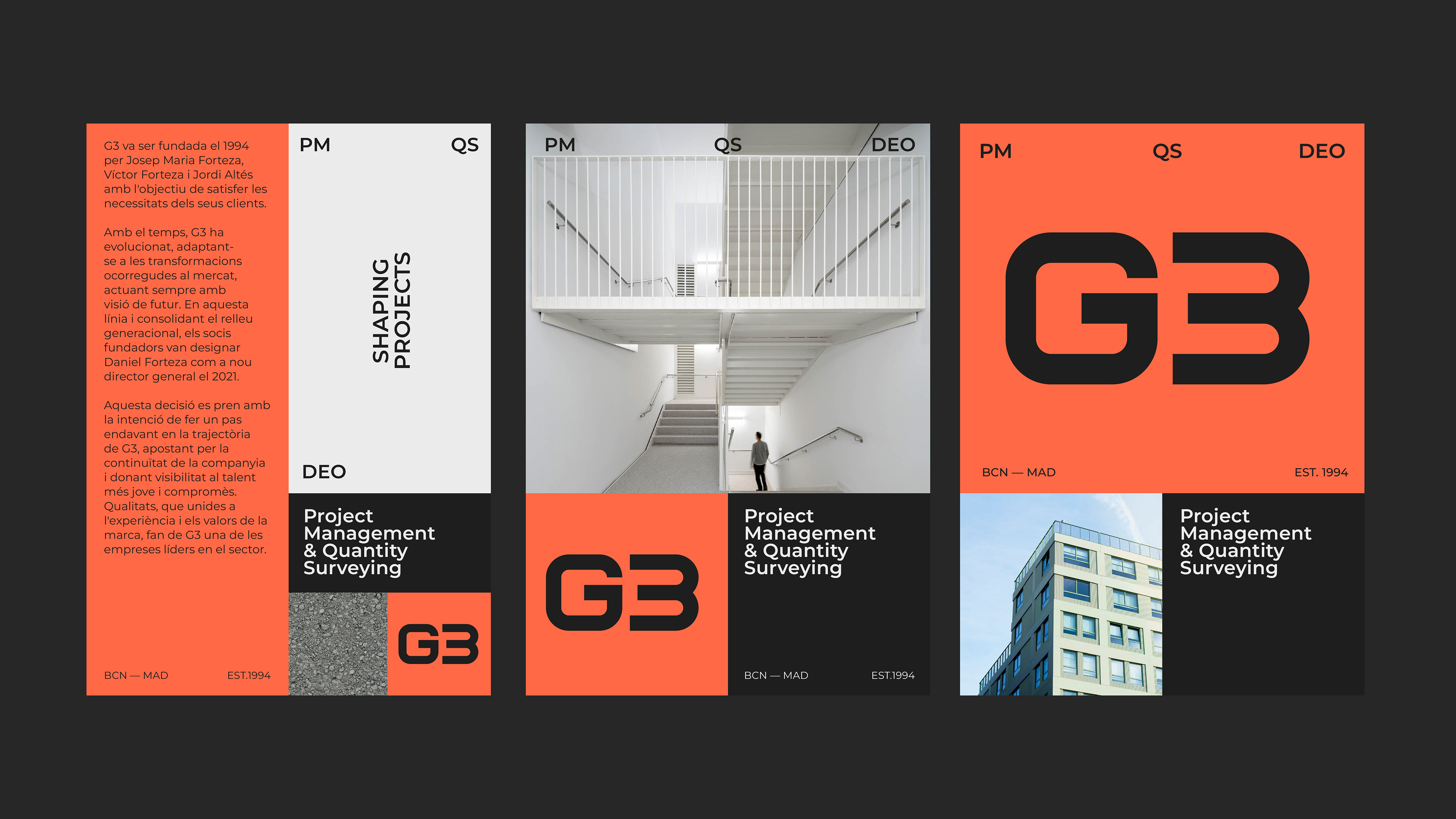 G3 és una empresa especialista i experta en serveis de project management i quantity surveying -per al sector de la construcció- adaptats a les necessitats de cada client. Revisió del posicionament, definició del relat i redisseny del sistema visual per crear una nova marca més coherent, adaptada a les noves tendències i fent que connecti millor amb els seus clients.