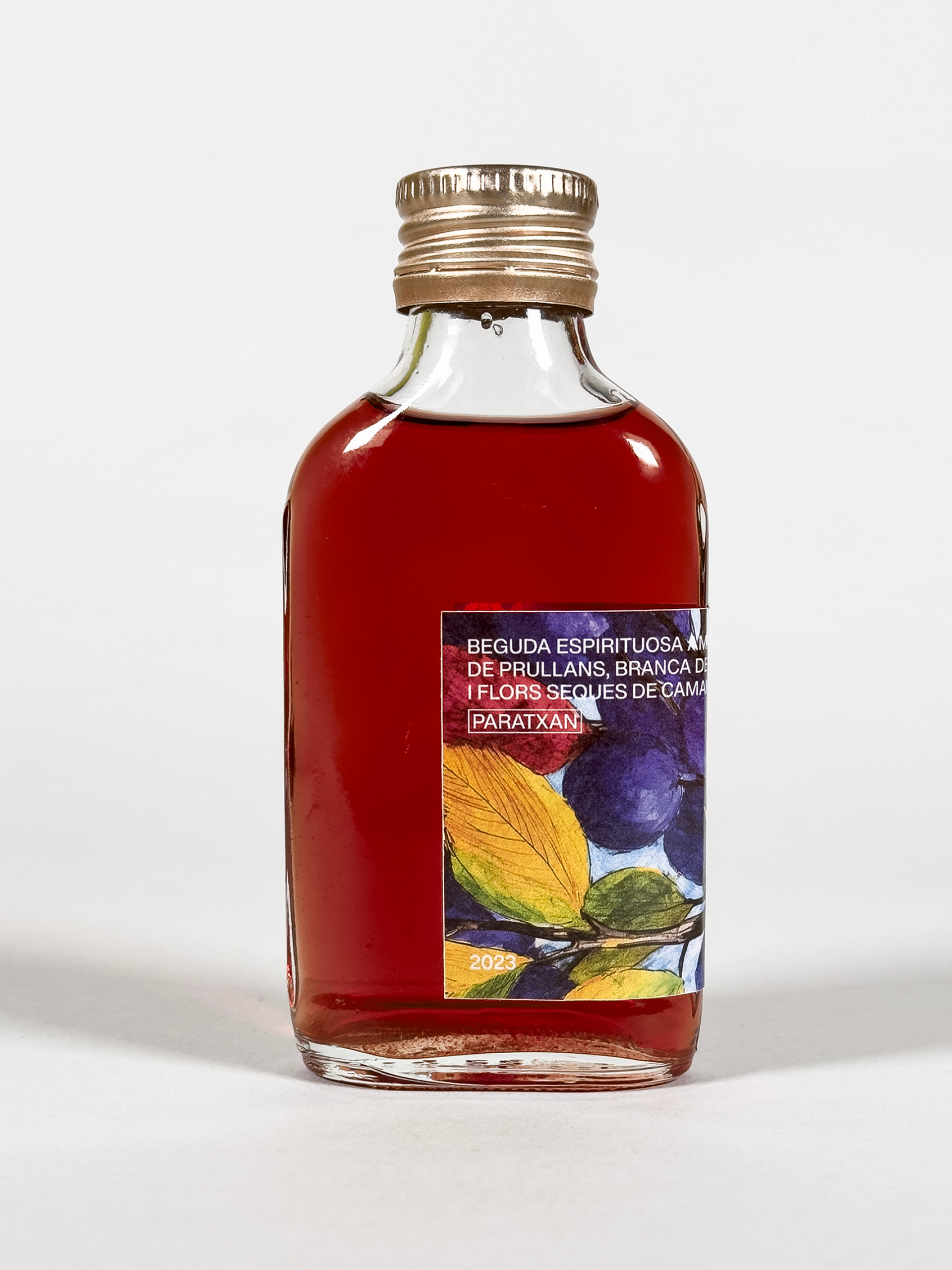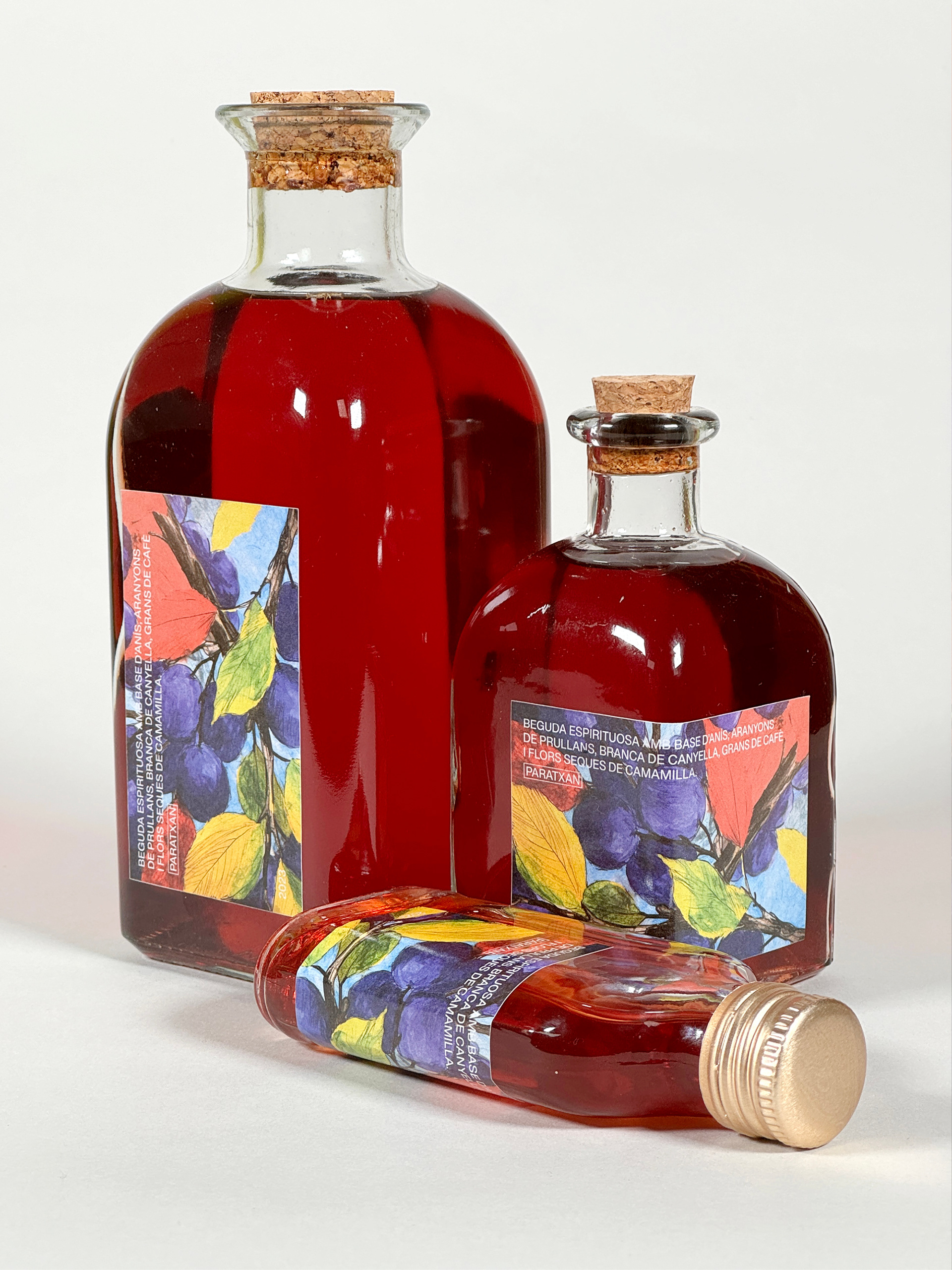 Disseny d'etiquetes de patxaran, beguda espirituosa amb base d’anís, aranyons de Prullans, branques de canyella, grans de cafè i flors seques de camamilla.